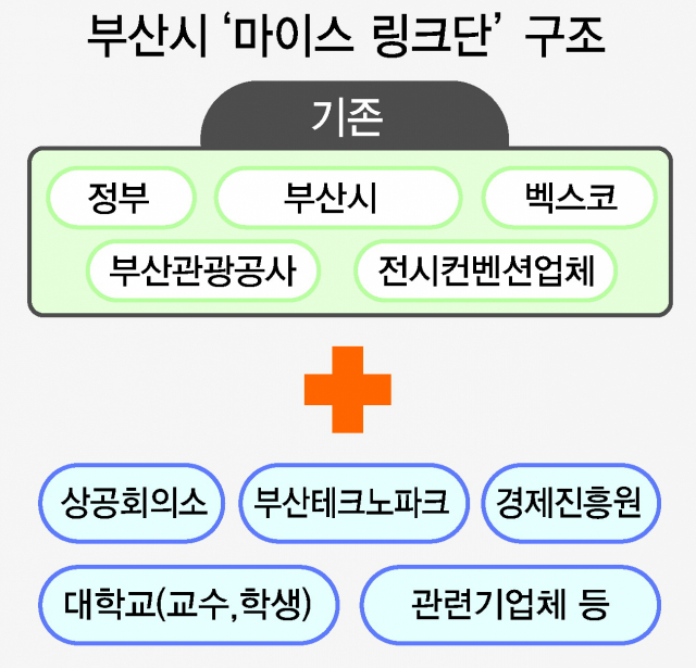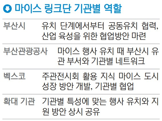 부산에서 펼쳐지는 마이스(MICE·회의 포상관광 컨벤션 전시) 행사를 지역 산업 육성 기회로 활용하기 위한 ‘마이스 링크단’이 오는 9월 출범한다.