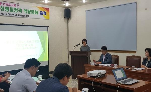 부산 동래구의회 의원연구단체인 성평등정책연구회(대표 김미화 의원)는 16일 동래구의회 제2위원회실에서, '동래구를 인권도시로! 성평등정책 역량강화'라는 주제로 양성평등정책 교육을 개최했다.