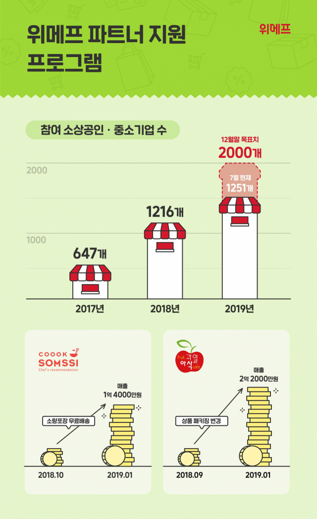 위메프는 2017년 위메프 파트너 지원 프로그램을 마련하고 2017년 647개, 2018년 1216개 파트너사에게 맞춤형 교육을 제공, 온라인 판로 개척을 지원했다. 올해 위메프에서 현재까지 해당 교육을 받은 소상공인 파트너사는 1251곳이다.