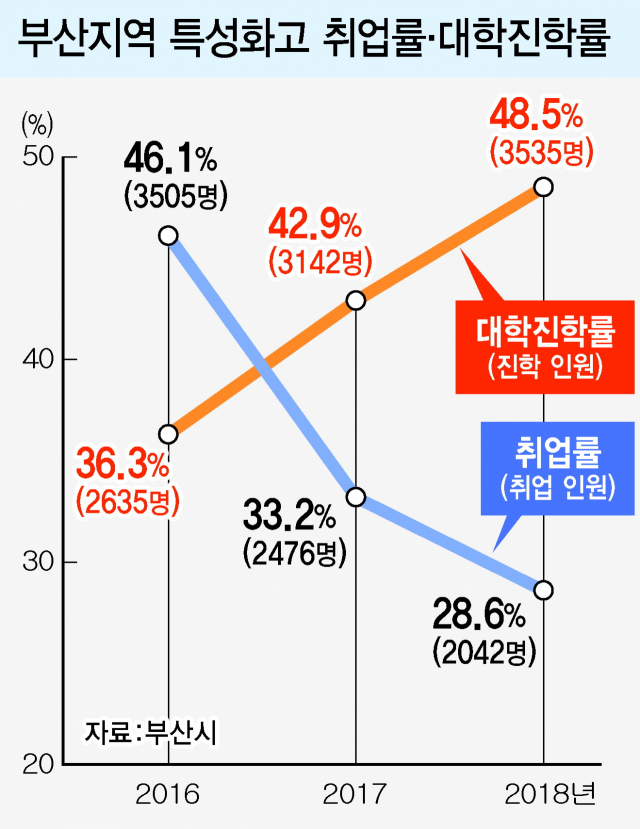 하지만 고졸 취업 활성화가 그렇게 간단한 문제는 아니다. 현재 부산에는 33개의 특성화고가 운영되고 있다. 특성화고는 고졸 취업의 요람이 돼야 하지만, 최근 성과는 그렇지 못했다. 부산지역 특성화고 졸업생의 취업률은 2016년 46.1%, 2017년 33.2%, 2018년 28.6%로 급격히 감소하고 있다. 반면 대학 진학률은 2016년 36.3%, 2017년 42.9%, 2018년 48.5%로 점차 늘어나고 있다. 부산의 한 특성화고 관계자는 “2017년 제주도 현장실습 안전사고 등 특성화고 실습현장에서 잇따라 안전문제가 불거지면서 학생과 학부모 사이에 불안감이 형성됐다”며 “이같은 심리가 진학률과 취업률에 반영된 것으로 보인다”고 말했다.