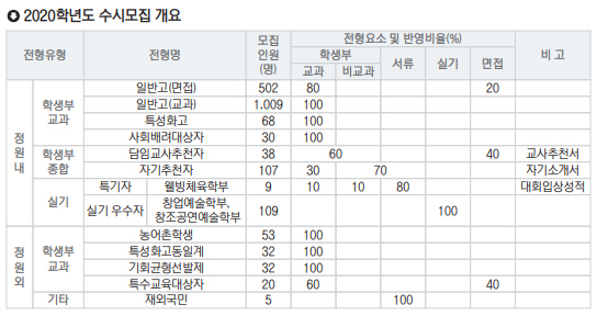 2019학년도 대비 일반고(면접)전형의 인원은 확대하고 일반고(교과)전형의 인원은 축소하였으며 특성화고졸재직자전형을 폐지한 것이 주요 변경사항이다.