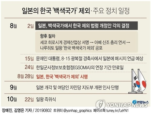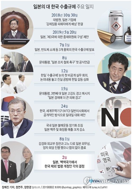 일본은 한국은 물론 미국을 비롯한 국제사회의 우려를 묵살하고 2일 각의(국무회의)를 열어 한국을 백색국가 명단인 '화이트리스트'에서 제외하는 수출무역관리령 개정안을 의결했다.