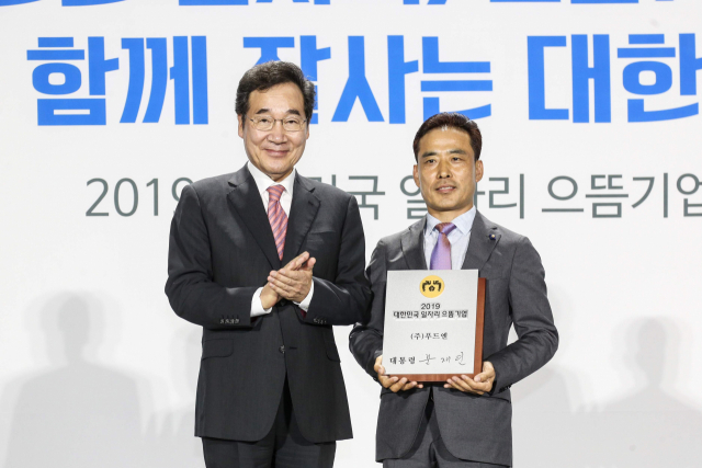김광원 ㈜푸드엔 대표이사는 이날 행사에서 이낙연 국무총리로부터 ‘2019 대한민국 일자리 으뜸기업’ 상을 수상(사진)했다.