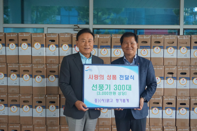 박수관(사진 왼쪽·㈜YC TEC 회장) 맑고 향기롭게 부산모임 회장은 5일 부산 동구청을 방문해 최형욱 동구청장에게 동구 내 어르신들과 저소득층, 장애인 가정을 위한 ‘사랑의 선풍기’ 300대(3000만 원 상당)를 기증했다. 이날 행사에는 박 회장을 비롯해 맑고 향기롭게 부산모임 임원진과 동구청 간부들이 참석했다.