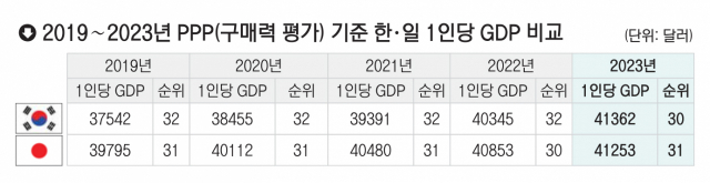하지만 이 같은 격차가 점차 좁혀져 2023년 PPP 기준 1인당 GDP는 한국이 4만 1362달러로 4만 1253달러인 일본을 앞지를 것으로 IMF는 내다봤다. 한국이 일본을 앞서게 되는 것은 IMF가 관련 통계를 보유한 1980년 이후 처음이다.
