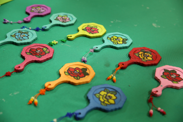 이후 거울의 한쪽 면에 부산을 상징하는 동백꽃 모양의 한지를 붙여주고 드라이기를 이용해 잘 말린다. 다른 한쪽은 거울을 부착한다. 마지막으로 손잡이 부분에 전통문양의 끈을 달아주면 고급스러운 느낌은 배가 된다.