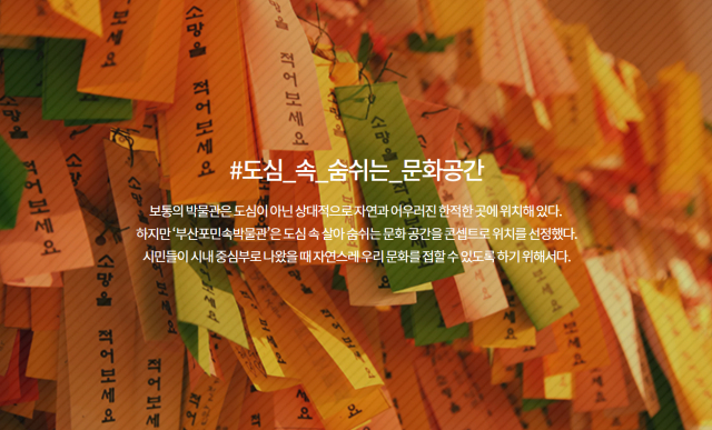 보통의 박물관은 도심이 아닌 상대적으로 자연과 어우러진 한적한 곳에 위치해 있다. 하지만 '부산포민속박물관'은 도심 속 살아 숨쉬는 문화 공간을 콘셉트로 위치를 선정했다. 시민들이 시내 중심부로 나왔을 때 자연스레 우리 문화를 접할 수 있도록 하기 위해서다.