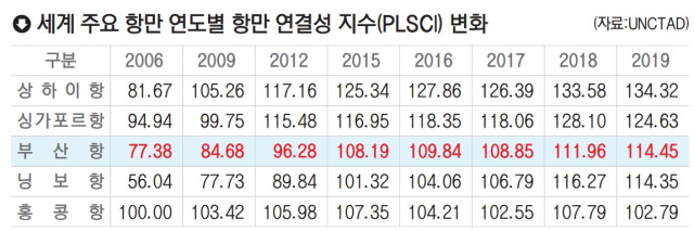 국제연합무역개발협의회(UNCTAD)가 지난 7일 발표한 2019년 항만 연결성 지수(PLSCI)에 따르면 부산항(114.45)은 중국 상하이항(134.32), 싱가포르항(124.63)에 이어 3위를 차지했다.