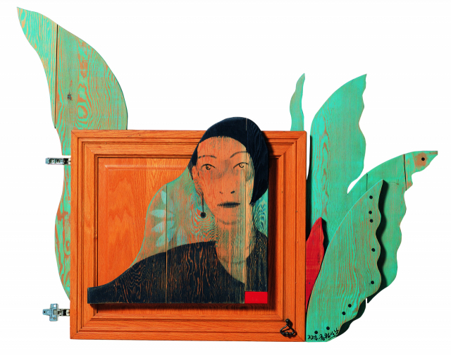‘여인’(사진)은 문짝을 이용해 그 위에 여인의 형상을 그린 나무판을 붙인 작품이다. 뒤로는 나풀거리는 파스텔 톤의 푸른색 풀잎 형상의 나무판이 붙어 전체 형상을 구성하고 있다. 나무판이라는 입체와 그 위에 형상을 그리고 채색하는 작업을 통해 입체적이면서도 평면적인 재료의 특성을 잘 살리고 있는 것이다. 짧은 머리에 귀걸이를 한 젊은 여인의 표정이 전체 조형과 잘 어우러져 평온함을 느낄 수 있는 색채와 함께 회화적인 입체, 입체적인 회화의 특유한 감성으로 다가온다.
