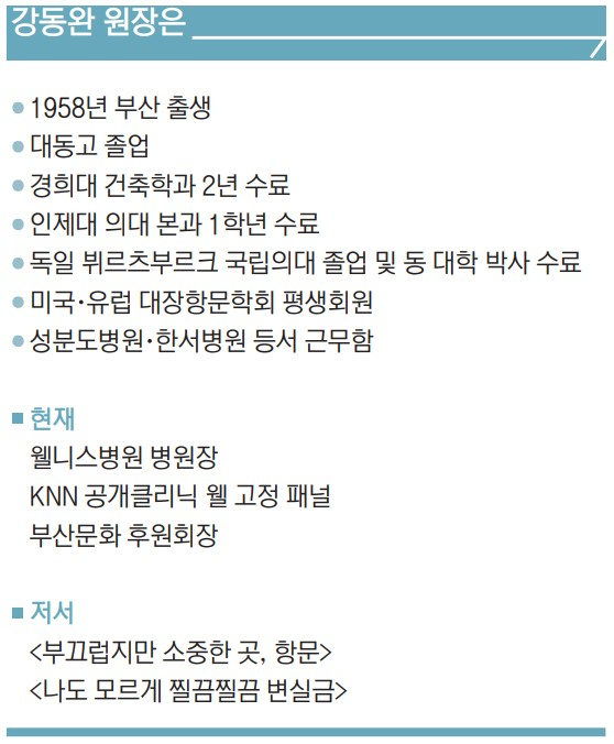 강동완 원장은 늦깎이 의사다. 그는 처음에는 공학도였다. 경희대 건축학과에 입학한 것. 2학년을 마치고 군에 갔다가 복학했는데, 중간고사를 치고 보니 낙제할 것만 같았다. 그래서 휴학을 하고 예비고사를 다시 쳐 인제대 의대에 입학했다. 인제대에서 3년간(본과 1학년) 공부한 그는 돌연 독일로 날아갔다. 그곳에서 9개월간 어학 코스를 다닌 후 대학에 응시했으며 뷔르츠부르크 국립의대에 입학했다. 그곳에서 6년간 공부하고 귀국, 다시 시험을 쳐 의사 자격증을 땄다. 먼 길을 돌고 돌아 온 셈이다. 어릴 때부터 어머니의 영향을 받아 음악을 좋아했다는 강 원장. 먼 길을 돈 게 결코 헛된 시간이 아니었다. 독일 선진 의료시스템에 일찍 눈을 떴고 병원 경영에 음악 등 예술을 접목시킴으로써 독특한 경영 수완을 보여 주고 있다. 한편 삼성여고와 부속 고아원, 삼성중을 운영하는 삼성학관의 강성봉 이사장이 그의 친형이다.