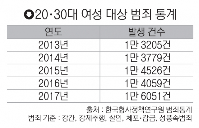한국형사정책연구원 범죄통계 자료에 따르면 젊은 층 여성을 대상으로 한 범죄는 점차 증가하고 있다.