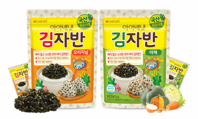 산양유아식 전문기업 아이배냇이 국산 원초를 듬뿍 담은 유아용 '아이배냇 김자반' 2종(사진)을 23일 출시했다고 이날 밝혔다. 영유아 김 시장에서 조미김류의 '유기농 보들김'과 후리카케류의 '솔솔뿌려먹는 레시피'로 인지도 선점을 해 온 아이배냇은 국산 원초와 국산 야채를 사용한 유아용 김자반으로 김 제품 영역 확장에 나섰다.