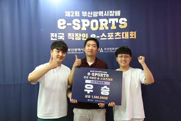 스타크래프트 종목 우승을 차지한 '삼일PwC'팀. 부산정보산업진흥원 제공.올해로 2회째를 맞이한 '부산광역시장배 전국 직장인 e스포츠 대회'가 356명이 참여한 가운데 성황리에 막을 내렸다.
