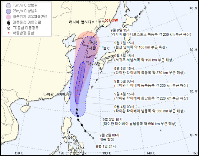 기상청은 링링이 6일 오전 9시에 서귀포 남서쪽 약 310㎞ 부근 해상까지 북상하면서 제주도부터 영향을 주기 시작해 8일 오전까지 부·울·경 지역을 비롯한 전국이 태풍 영향권에 들 것으로 내다봤다. 기상청은 다만 태풍의 북상 정도에 따라 진로 등 변동 가능성이 매우 커 앞으로 발표되는 태풍정보를 참고할 것을 당부했다.