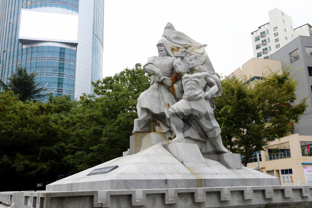 부산 임진왜란 영웅 윤흥신 장군 석상(사진)을 동상으로 교체하자는 요구가 수년째 계속되고 있지만, 부산시는 올해도 마땅한 해결책을 찾지 못하고 있다.