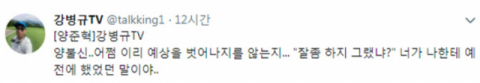 강병규는 19일 자신의 트위터 계정에 "양불신, 어쩜 이리 예상을 벗어나지 않는지… ‘잘 좀 하지 그랬냐?’ 네가 나한테 예전에 했던 말이다”라고 전했다.
