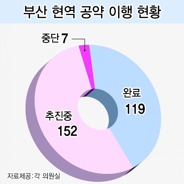 부산 지역 20대 국회의원들의 공약 이행률이 43%에 그쳤다. 재보선 선거로 당선된 윤준호(해운대을) 의원을 제외한 지역 의원 17명은 2016년 총선 당시 모두 278개의 지역 공약을 냈고 19일 기준 119개만 이행한 것으로 나타났다. 유권자와의 ‘공적 계약’을 절반도 지키지 않은 셈이다. 각 의원실에서 공약이행현황을 자체 분석한 자료를 취합해 평가한 결과다.
