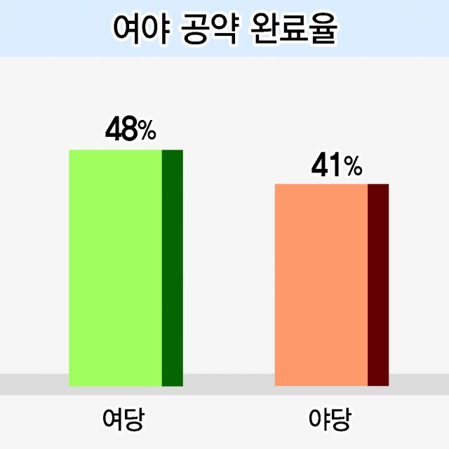 여야 의원들의 성적도 갈렸다. 여당인 더불어민주당에서 윤 의원을 제외한 5명은 75개 공약 중 36개를 완료해 48%를 기록했다. 야당인 자유한국당과 바른미래당 의원 12명은 203개 중 83개로 이행률 41%로 집계됐다.
