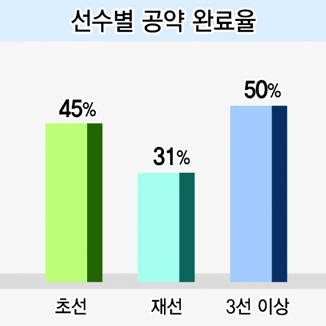지역 재선인 김도읍·장제원·이헌승·하태경 의원은 88개 공약 가운데 27개만 완료 공약으로 평가, 31%의 이행률을 기록했다. 초선(박재호·윤상직·최인호·전재수·김해영) 이행률(45%·73개 중 33개 이행)에도 크게 못 미쳤다.