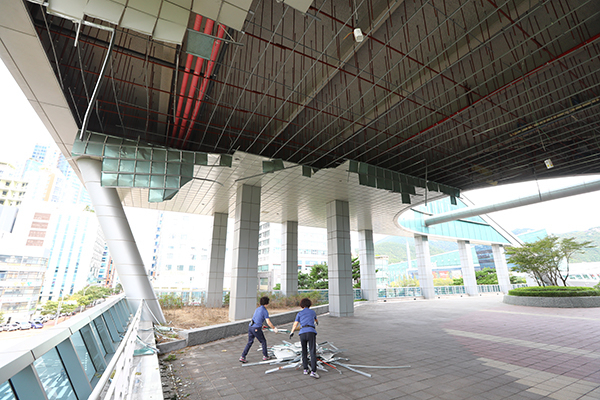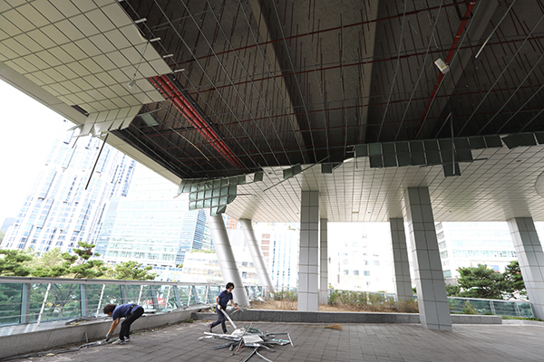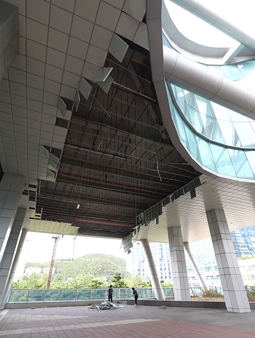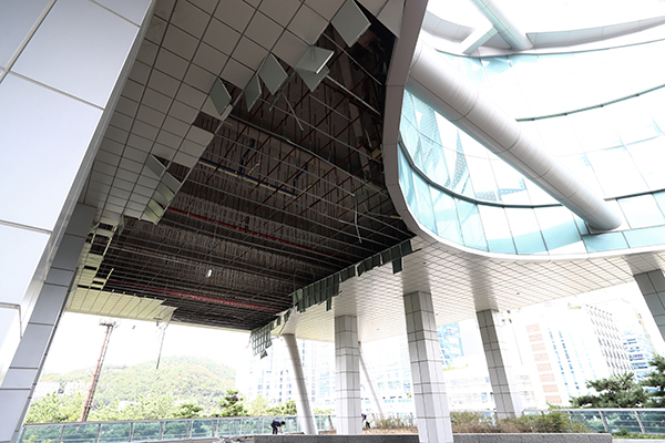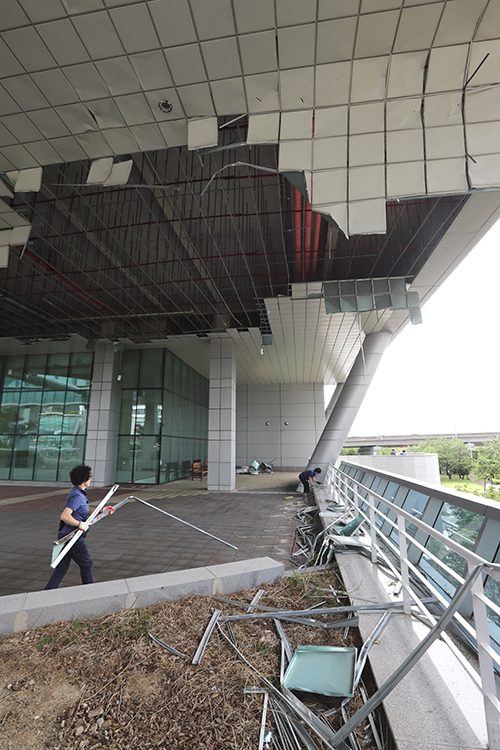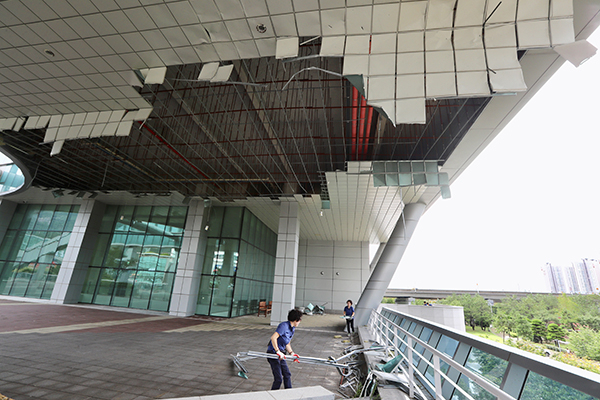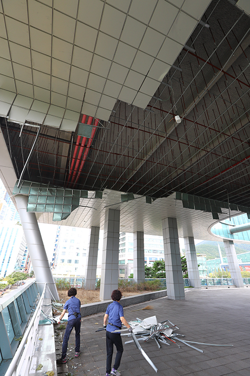 [포토뉴스] 태풍 '타파'에 뜯겨 나간 벡스코 천장