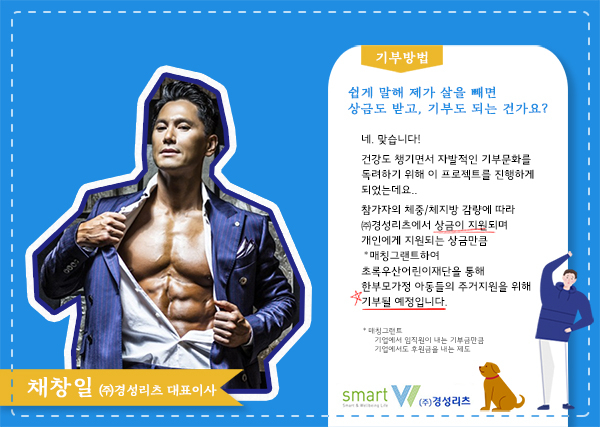 참가자들이 체중 1kg을 감량할 때마다 경성리츠가 3만 원을 적립, 초록우산어린이재단을 통해 부산 지역 주거환경이 열악한 한 부모 가정 아동들의 주거 이전과 월세지원금으로 기부할 예정이다.
