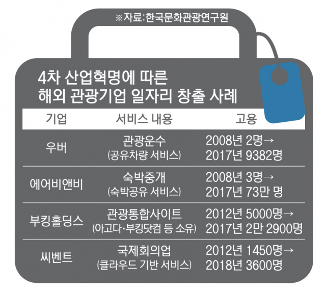 4차 산업혁명 시대에 맞는 융복합 산업으로서 성장 잠재력도 크다. 우석봉 부산연구원 선임연구위원은 “관광·마이스는 융복합과 신산업에 있어서도 단골 메뉴”라며 “가상현실(VR)과 증강현실(AR), 정보통신기술(ICT)와 접목시켜 새로운 서비스를 창출할 가능성이 높다”고 강조했다. 실제로 우버와 에어비앤비, 부킹홀딩스, 옐프, 씨벤트 같은 해외 관광기업은 4차 산업혁명을 통한 일자리 창출 성과를 이뤄내고 있다.