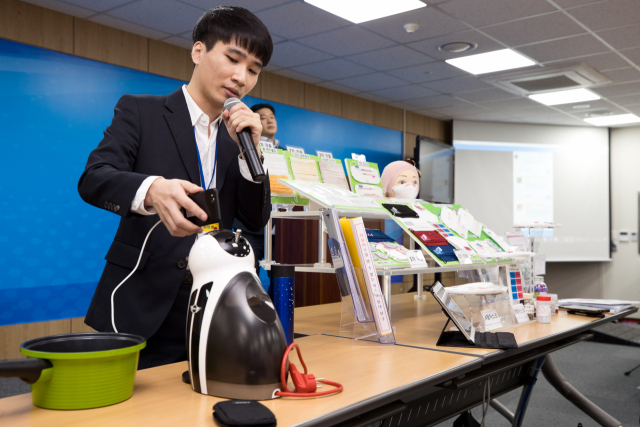 한국과학기술원(KAIST) 관계자가 1일 오전 세종시 과기정통부 기자실에서 '스마트폰으로 두드려 사물을 인식하는 신기술 개발' 관련 시연을 하고 있다. 과학기술정보통신부 제공.