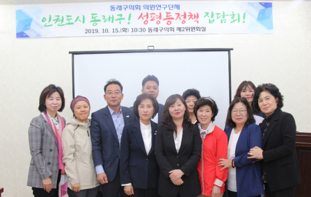 부산 동래구의회 의원연구단체인 성평등정책연구회(대표 김미화)는 15일 동래구의회 제2위원회실에서 개인의 존엄과 인권존중을 바탕으로 성차별의식과 관행을 해소하고, 모든 영역에서 남녀가 동등한 활동 기회를 가져 권리와 책임을 함께 공유하는 성평등 정책 발굴에 대한 다양한 의견을 나누기 위한 목적으로'성평등정책 집담회'를 개최했다.