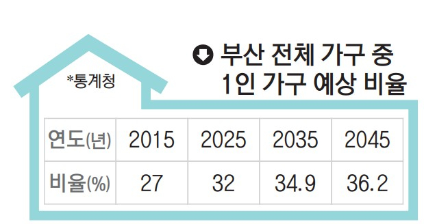 20일 통계청의 ‘2015~2045년 시·도별 장래가구특별추계’에 따르면 2025년 부산 전체 가구 중 1인 가구 비율은 32%까지 높아지는 것으로 예상됐다. 2015년은 27%로 넷 중 한 가구를 겨우 넘겼지만, 10년 만에 셋 중 한 가구 정도까지 늘어난다는 것이다. 2035년과 2045년에는 각각 34.9%와 36.2%로 계속 증가할 전망이다.