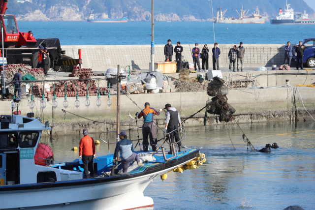 한·아세안 특별정상회의 개최를 한 달가량 앞둔 28일 오후 부산 서구 송도해수욕장 인근 암남항에서 부산해경과 전문 잠수부들이 중장비를 동원해 수중 폐기물을 수거하고 있다. 김경현 기자 view@