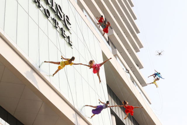 3일 오후 부산 영도구 봉래동 라발스호텔 외벽을 무대로 버티컬 댄스 공연 ‘견딜 수 없는 아름다움’이 펼쳐졌다. 부산 최초로 열린 이번 버티컬 댄스 공연은 등반 장비를 이용해 고층빌딩의 외벽이나 암벽, 자연을 무대로 몸을 통해 표현하는 예술장르다. 정종회 기자 jjh@