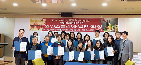 대동대학교(총장 배순철)는 지난 5일 대동빌딩 소믈리에 실습실에서 대학-지역 간 평생교육 협력사업의 일환으로 와인 소믈리에(일반)과정 수료식이 있었다.
