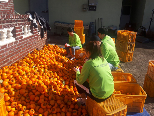부산 신라대 학생 200여 명이 지난 7~10일 경남 산청군 시천면 농가를 찾아 감 수확 일손돕기와 마을 벽화 그리기 등 봉사활동을 펼쳤다.