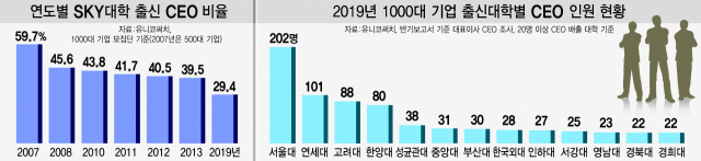 또 500대 기업 대상으로 조사했던 지난 2007년 59.7%와 비교하면 무려 30%P 이상 줄어들었다. 재계에서 10명 중 6명이 SKY대 출신이었던 것이 지금은 3명도 되지 않은 셈이다.