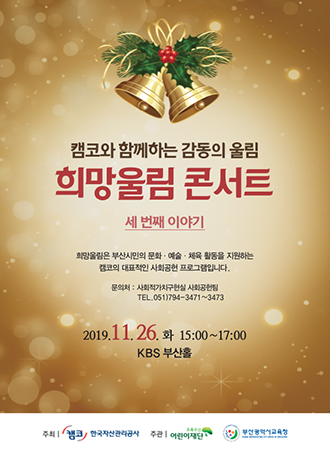 캠코(한국자산관리공사, 사장 문창용)는 오는 26일 오후 3시 부산 KBS홀(수영구 남천동 소재)에서 부산시민들을 초대하여 감동의 울림이 가득한 「캠코 희망울림콘서트 시즌3」를 개최한다고 밝혔다.