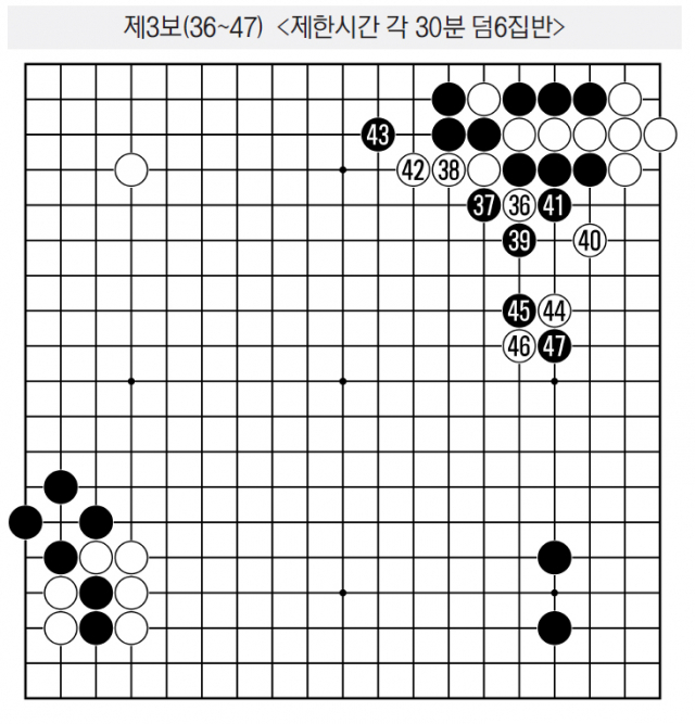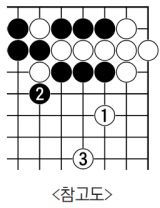 백36으로 젖히는 것은 축이 백에게 좋지 않아서 축머리를 방해하는 임기응변이다. 흑37,39로 거칠 게 두는 것도 축의 공방을 둘러싼 유의미한 수. 여기서 평범하게 〈참고도〉 백1처럼 이어진다면 흑2로 기분 좋게 잡아서 축이 좋으니 흑이 만족이다. 백42,44로 양쪽 모두 돌보면서 백은 일단 한숨을 돌린다. 이 구도는 빵때림을 한 흑으로서는 나쁠 이유는 없다. 신진서는 계속 몰아치기로 결정했다. 흑45로 붙이더니 백46을 기다린 다음 흑47로 커트. 진재호 바둑평론가