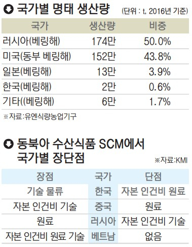 반면 우리나라는 러시아로부터 20만 t의 냉동명태를 수입해 주로 내수용으로 쓰는 등 ‘글로벌 명태 비즈니스’에서는 변방국에 머물러 있다.