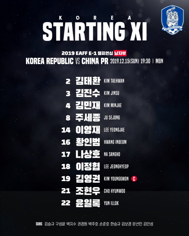 15일 오후 7시 30분 부산아시아드주경기장에서 열리는 중국과 2019 동아시아축구연맹(EAFF) E-1 챔피언십 2차전에 출전할 선수들의 명단이 공개됐다.