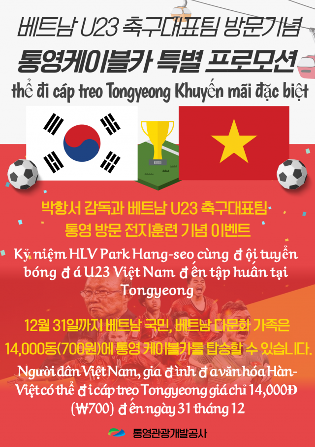 경남 통영케이블카가 박항서 감독이 이끄는 베트남 23세 이하(U-23) 축구 국가대표팀 통영방문을 기념해 특별 프로모션을 준비했다.