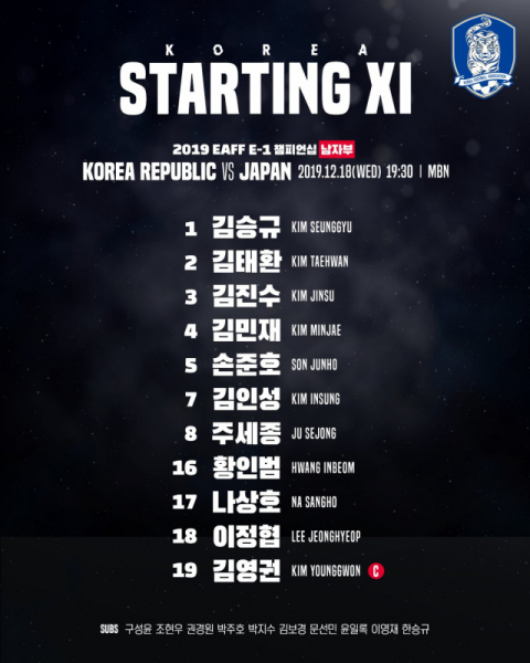 18일 오후 7시 30분 부산 아시아드주경기장에서 펼쳐질 예정인 2019 동아시아축구연맹(EAFF) E-1 챔피언십 남자부 3차전 '한국-일본' 경기에 출전한 선수 라인업이 공개됐다.