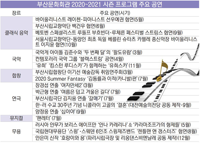 베토벤 전문 피아니스트 루돌프 부흐빈더, 피아니스트 선우예권·바이올리니스트 레이첸 협연, 무용가 안은미 신작, 가수 이승환 콘서트…. 부산문화회관이 발표한 2020 시즌 공연 중 핵심 프로그램이다.