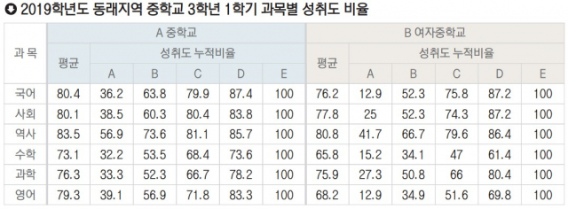 올해 동래 지역 A중학교와 B여자중학교를 비교 해 보면 국어는 A중은 36.2%가 성취도 A였고 B여중은 12.9%로 23.3% 차를 보였습니다. 역사 과목은 A중은 성취도 A, B를 받은 학생이 전체의 73.6%로 나타났고, B여중의 수학의 경우 성취도 A, B를 받은 학생이 전체의 36.1%로 나타나 과목의 난이도에 따라 그 차가 크게 나타남을 알 수 있습니다.