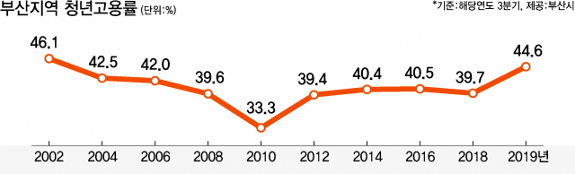 늘어난 정부 지원과 청년 창업 덕에 부산 청년고용률이 2002년 이후 가장 높은 수준을 기록했다. 부산시는 일자리의 양적 부분뿐만 질적 개선에도 박차를 가해 청년 유출 현상을 막겠다는 계획이다.