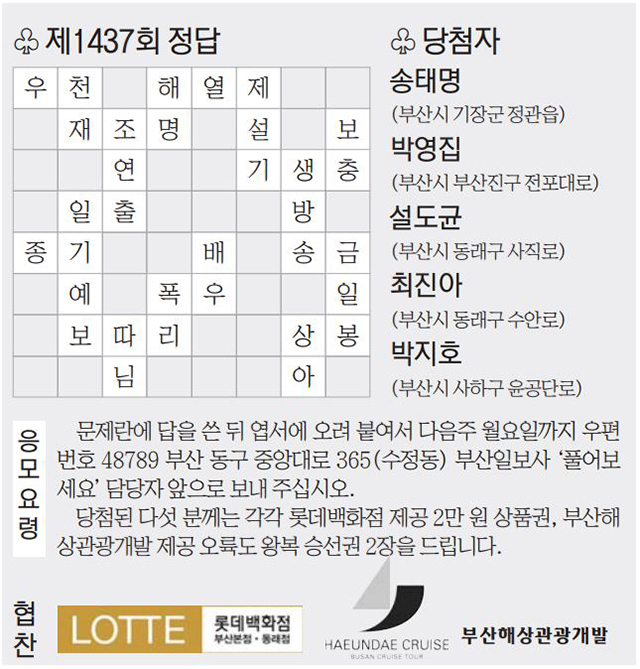 문제란에 답을 쓴 뒤 엽서에 오려 붙여서 다음주 화요일까지 우편번호 48789 부산 동구 중앙대로 365(수정동) 부산일보사 ‘풀어보세요’ 담당자 앞으로 보내 주십시오.