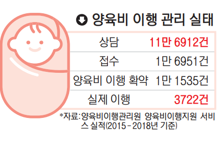 양육비이행관리원이 2015년 설립됐지만 양육비를 받기는 여전히 어렵다. 부산여성가족개발원 김혜정 박사에 따르면 2018년까지 관리원을 통해 양육비 이행 확약을 한 1만 1535건 중 실제 양육비가 지급된 건은 3722건으로 이행률은 32.3%, 서비스 접수 건수(1만 6951건) 중 이행률을 따지면 22.0% 수준이다. 신청자 열 명 중 두 명만이 실제 양육비를 받은 셈이다.