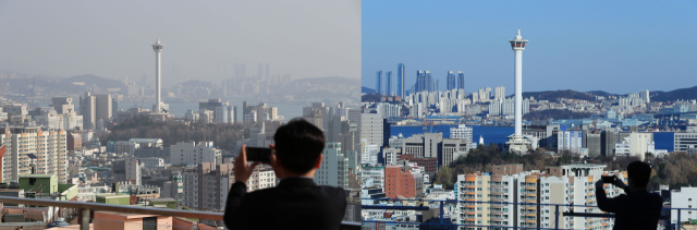 부산지역 미세먼지와 초미세먼지가 모두 나쁨 단계를 보인 20일 오전 부산 서구 초장동 천마산로에서 바라본 시내가 미세먼지로 흐려 보인다(왼쪽). 오른쪽 사진은 지난해 12월 맑은 날씨 속에 같은 장소에서 촬영한 모습. 김경현 기자 view@
