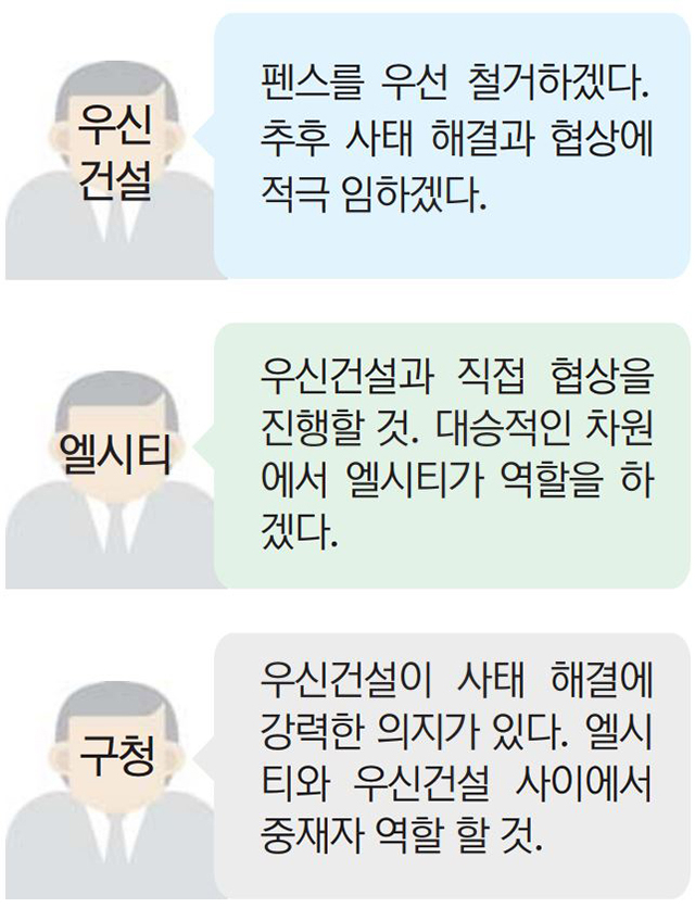 이 자리에서 우신건설은 “펜스 철거와 협의 매매 등에 적극적으로 임하겠다”며 “시민의 불편을 초래하는 펜스를 최대한 빨리 철거하겠다”는 입장을 전달했다.