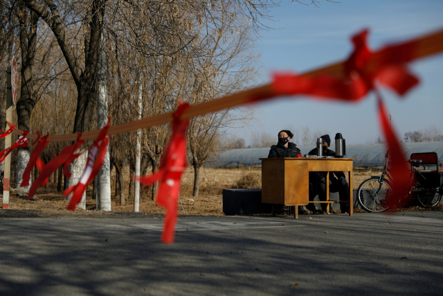 중국 베이징 외곽에서 신종 코로나바이러스 확산을 막는다며 28일(현지시간) 지역 주민들이 타 지역 사람들의 출입을 막기 위해 경계지에서 감시활동을 하고 있다. 로이터 연합뉴스