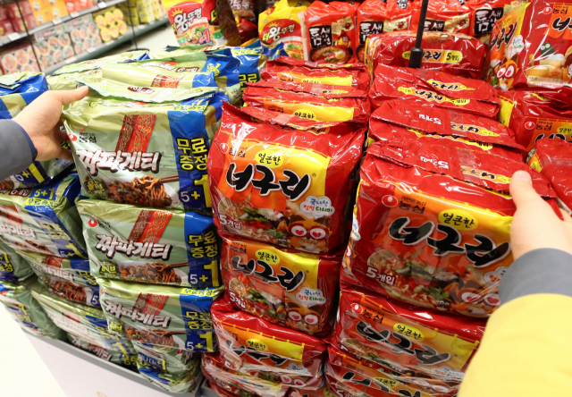 아카데미 수상을 계기로 짜파구리가 주목받기 시작하자 한 대형마트에서 너구리와 짜파게티 라면을 나란히 진열하고 있다. 연합뉴스
