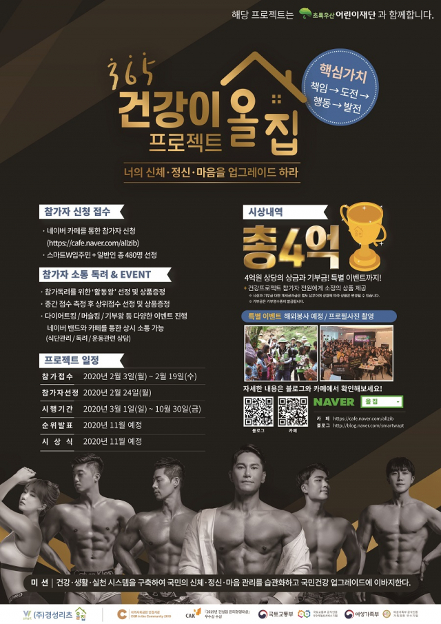㈜경성리츠(대표 채창일)는 2020년 ‘너의 신체·정신·마음을 업그레이드 하라’슬로건 아래 '제5회 스마트W 365건강이올집 프로젝트'를 진행한다. 참가신청 및 접수는 2월19일 마감하며, 발대식 및 인바디 1차 측정은 3월1일 실시한다.